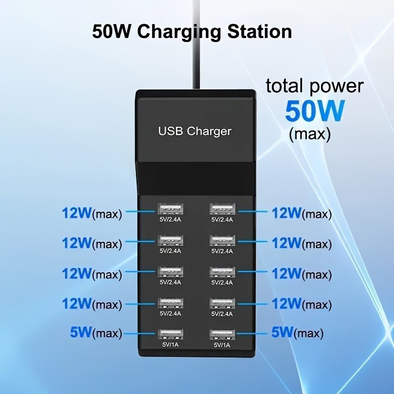 50W10 Port USB Mobile Phone Charger 5V2.4A Multi-port USB Charging Stake Charging Station Compatible With Android Apple System Various Models Of Mobile Phones. Tablets. Earphones. Smart Watches. Bracelet Charging